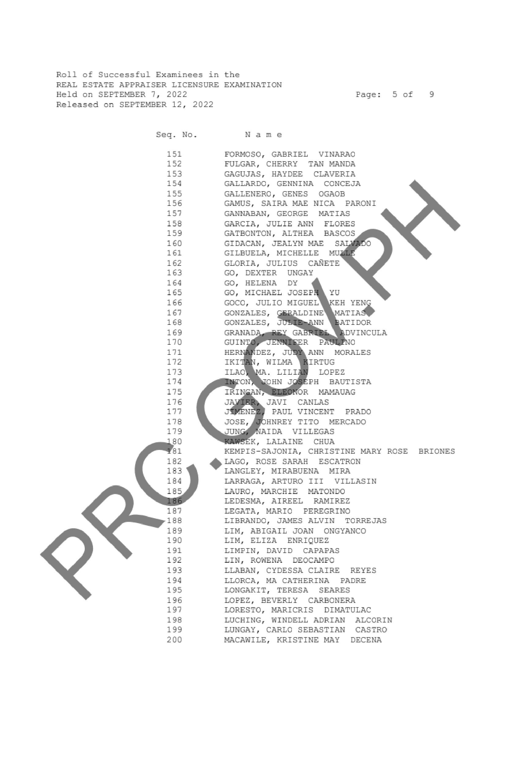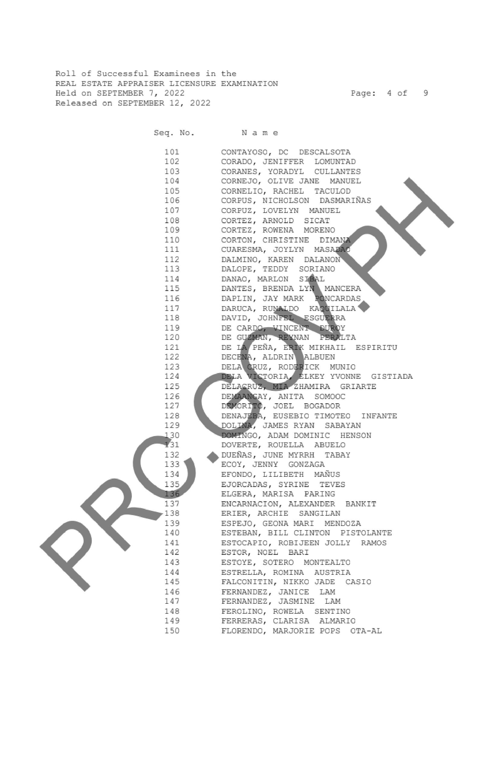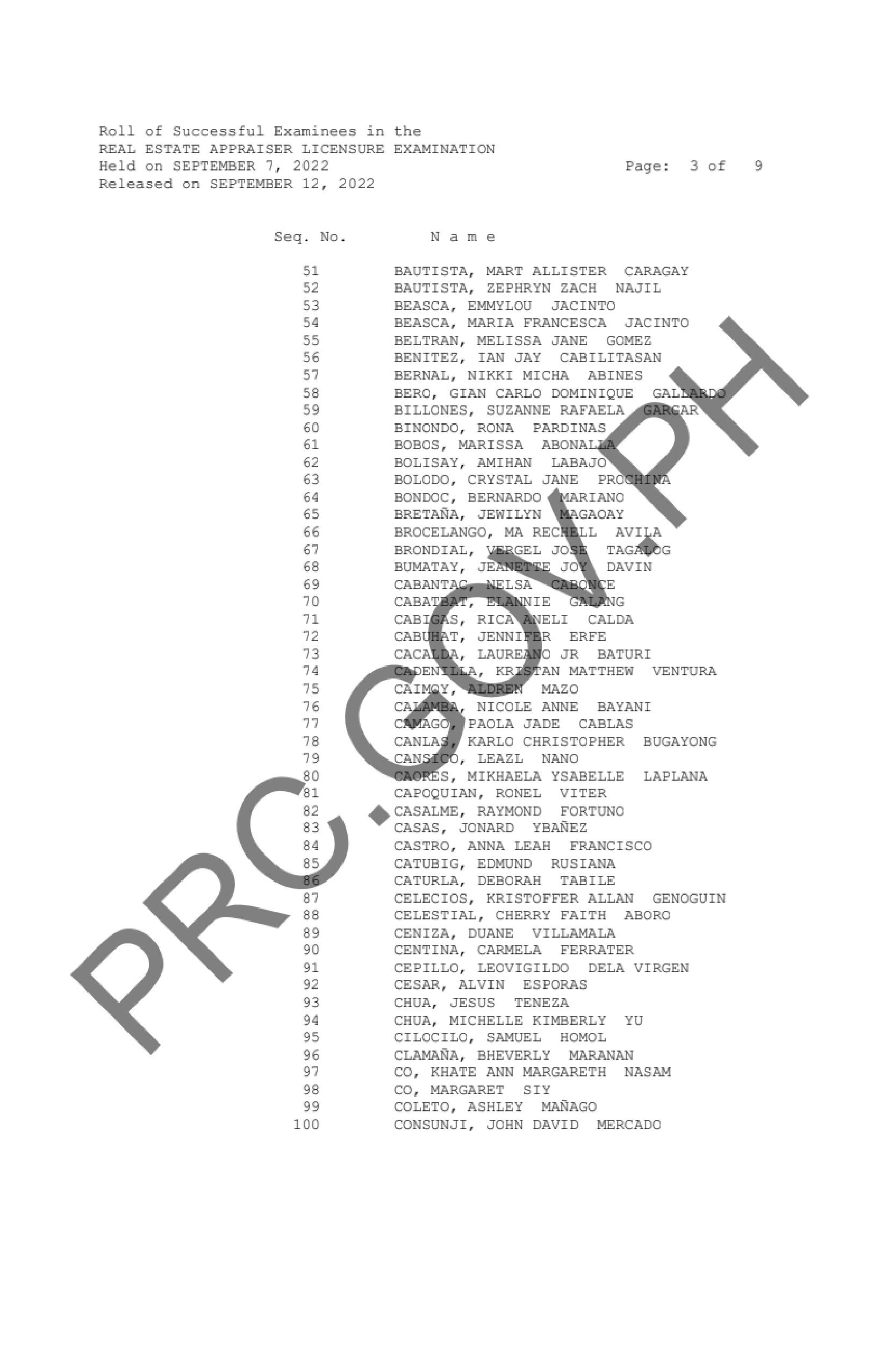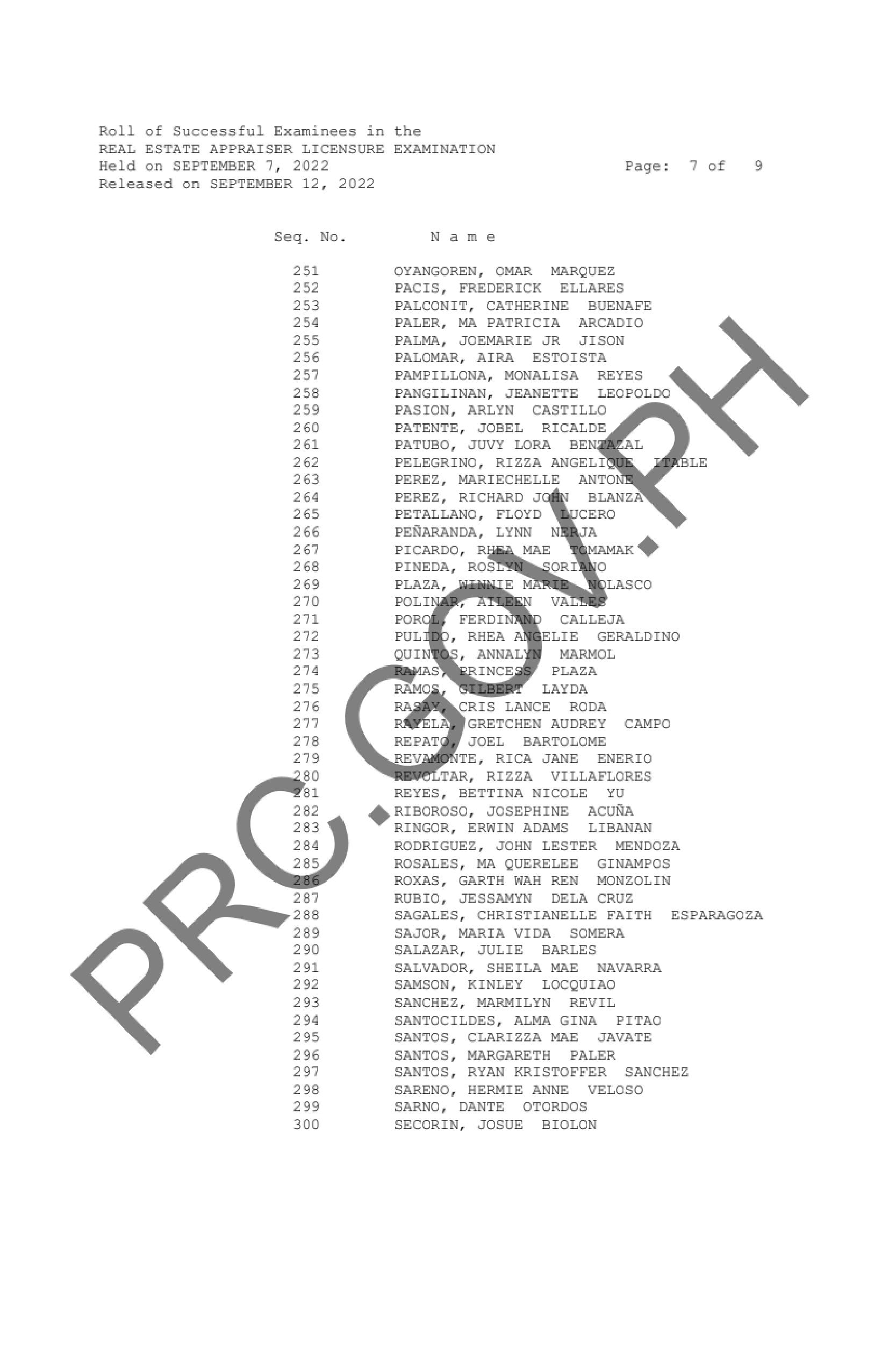 The Professional Regulation Commission (PRC) announces that 356 out of 626 passed the Real Estate Appraiser Licensure Examination given by the Board of Real Estate Service in Manila, Baguio, Cagayan de Oro, Cebu, Davao, Iloilo, Legazpi and Tacloban this September 2022.